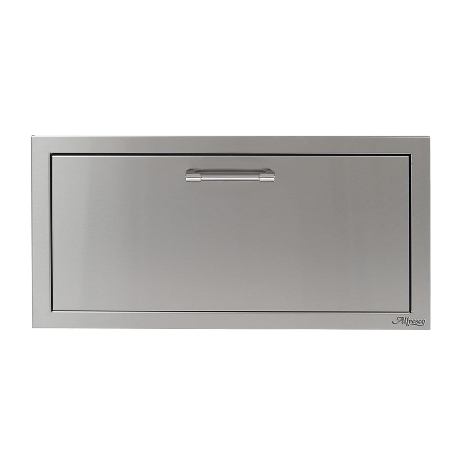 Designed to accommodate large accessories like pots and pans, this oversized drawer offers ample space to keep your outdoor cooking essentials organized and within reach. The subtle stamped Alfresco logo adds a touch of sophistication while maintaining a sleek and modern look that complements any outdoor kitchen design.