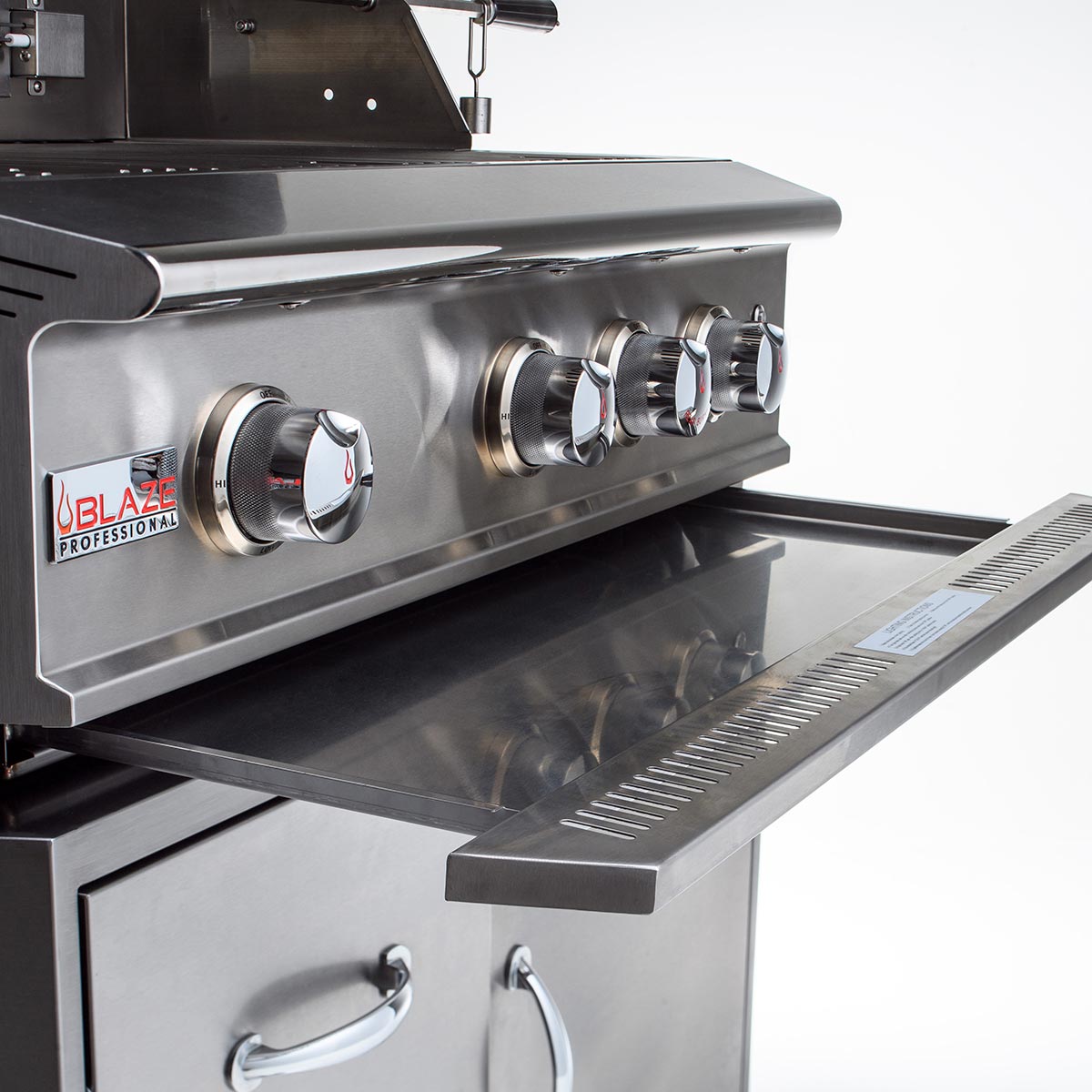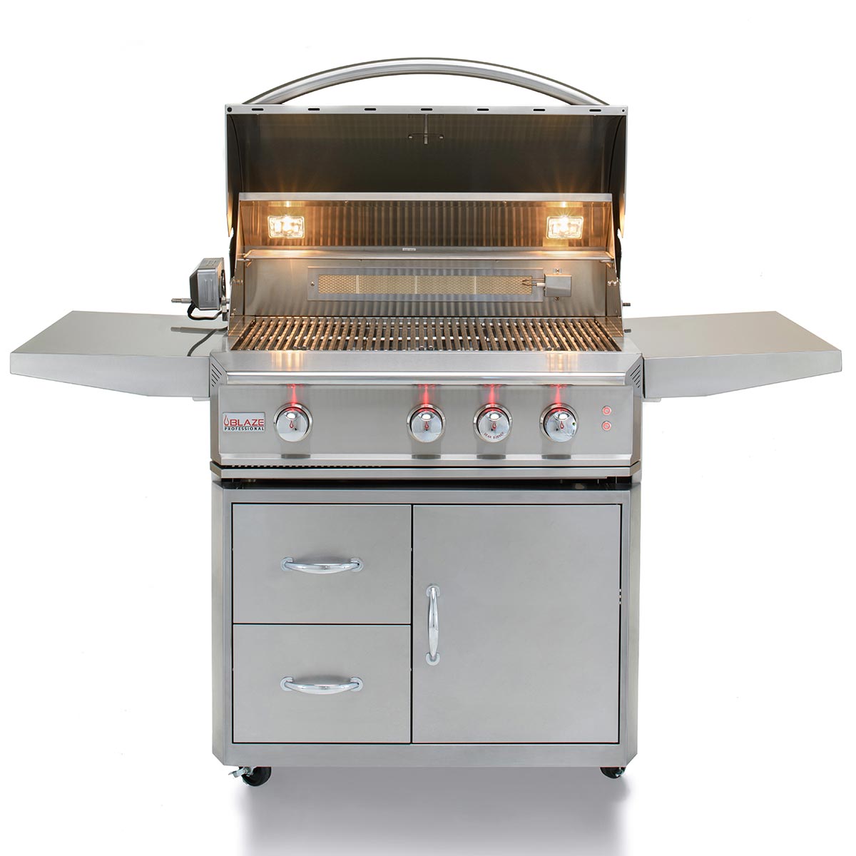 The BLZ-3PRO Professional Built-In Gas Grill with Rear Infrared Burner, 34-inch by Blaze provides a high performing luxury grill loaded with features to enhance your grilling experience. The heavy duty 304 stainless steel construction throughout the grill body ensures a long-lasting and durable appliance while the impressive cast stainless steel H-burners offer a commercial quality burner, rated for 18,000 BTU each. The integrated heat zone separators allow you to create distinct grilling zones for direct/indirect grilling that's perfect for everything from steak to ribs while the perforated flame stabilizing grids do a great job to reduce flare-ups. Heavy duty 12mm stainless steel hexagonal grill grates maximizes surface area for professional style sear marks while the infrared back burner is rated for 10,000 BTU to provide a wealth of heat for low, slow rotisserie cooking. The integrated interior grill lights illuminate the grill surface for day or night grilling while back-lit knobs enhance the appearance of the grill.