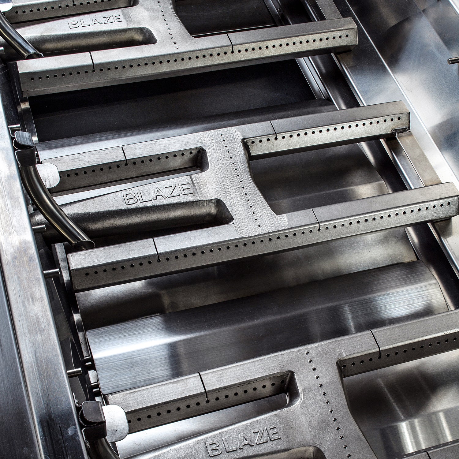 The BLZ-3PRO Professional Built-In Gas Grill with Rear Infrared Burner, 34-inch by Blaze provides a high performing luxury grill loaded with features to enhance your grilling experience. The heavy duty 304 stainless steel construction throughout the grill body ensures a long-lasting and durable appliance while the impressive cast stainless steel H-burners offer a commercial quality burner, rated for 18,000 BTU each. The integrated heat zone separators allow you to create distinct grilling zones for direct/indirect grilling that's perfect for everything from steak to ribs while the perforated flame stabilizing grids do a great job to reduce flare-ups. Heavy duty 12mm stainless steel hexagonal grill grates maximizes surface area for professional style sear marks while the infrared back burner is rated for 10,000 BTU to provide a wealth of heat for low, slow rotisserie cooking. The integrated interior grill lights illuminate the grill surface for day or night grilling while back-lit knobs enhance the appearance of the grill.