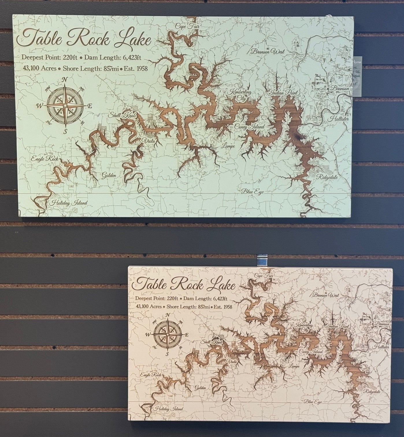American Made Proudly crafted in the USA, this art embodies the spirit of American craftsmanship. Each map of Table Rock Lake is a unique creation that reflects the care and skill of the artisans.
