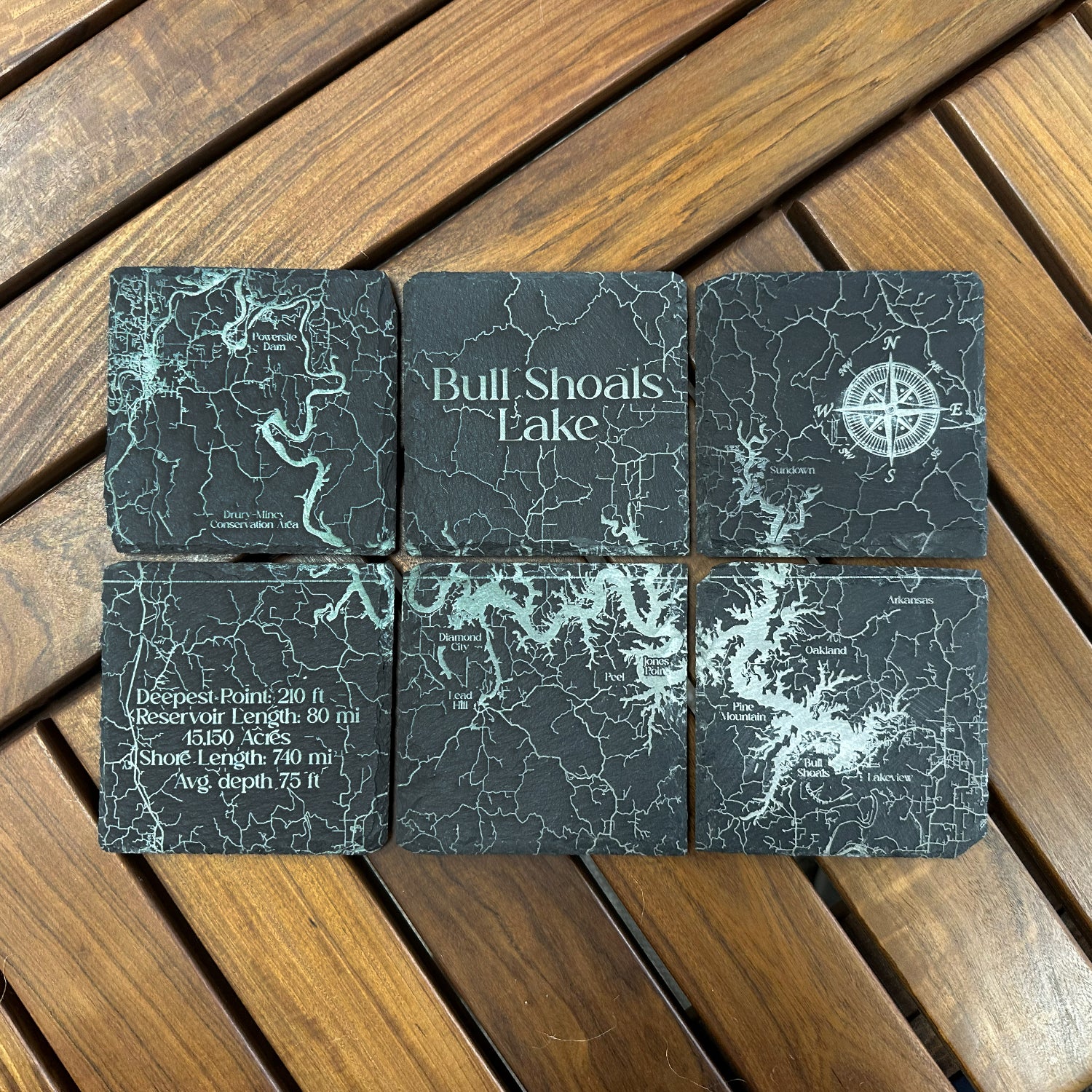 Etched Bull Shoals Lake Slate Coasters Set (6 Pack - 4"x4")