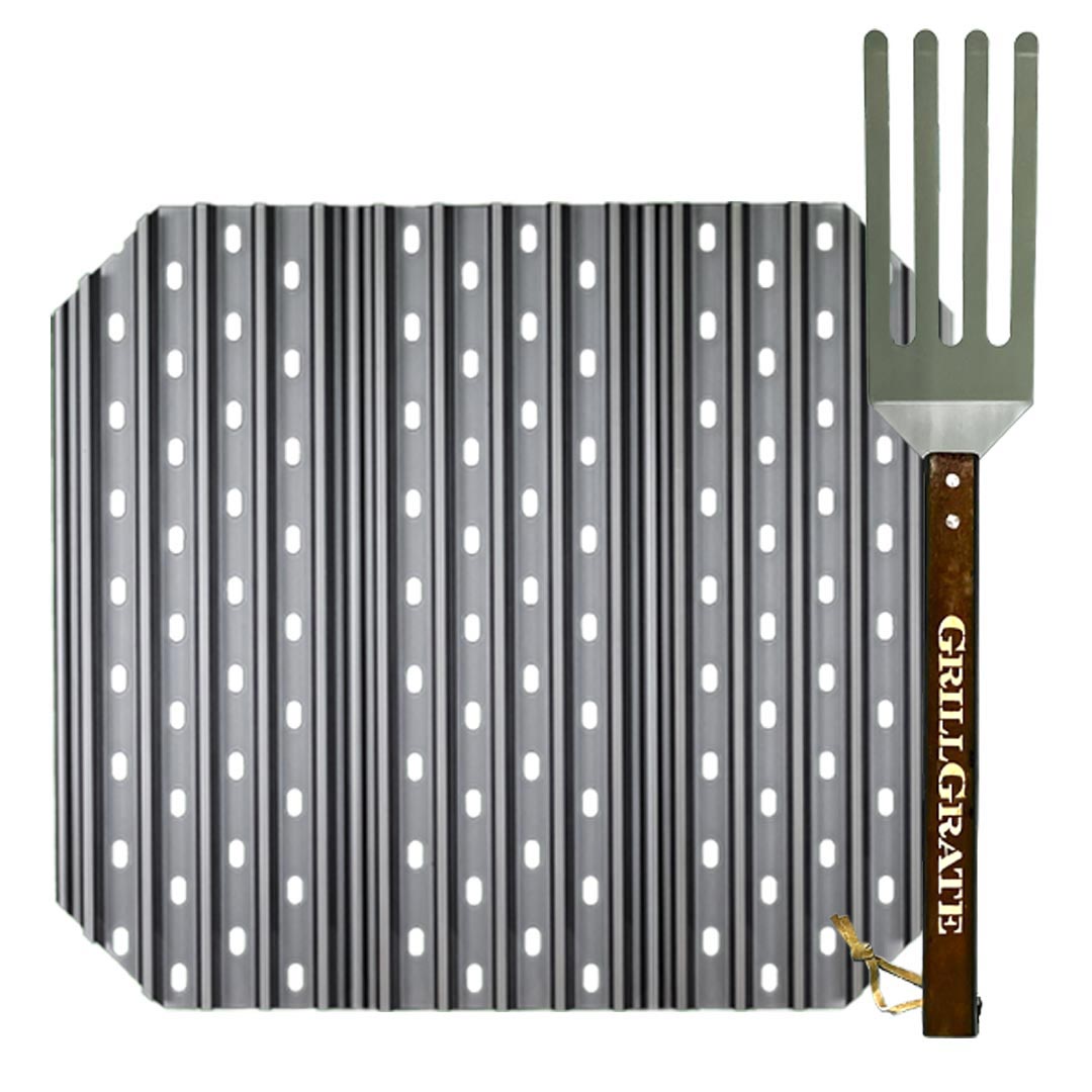 GrillGrates provide protected, high-heat grilling on the Large Big Green Egg. The bottom plate blocks hot rushing air and flames from charring and drying out food, keeping the juices sizzling with the food instead of feeding the flames. GrillGrates are used on top of the existing grate surface. Every set comes with a GrateTool which is part fork, part spatula that fits between the rails to get under your food and lift it without scraping.