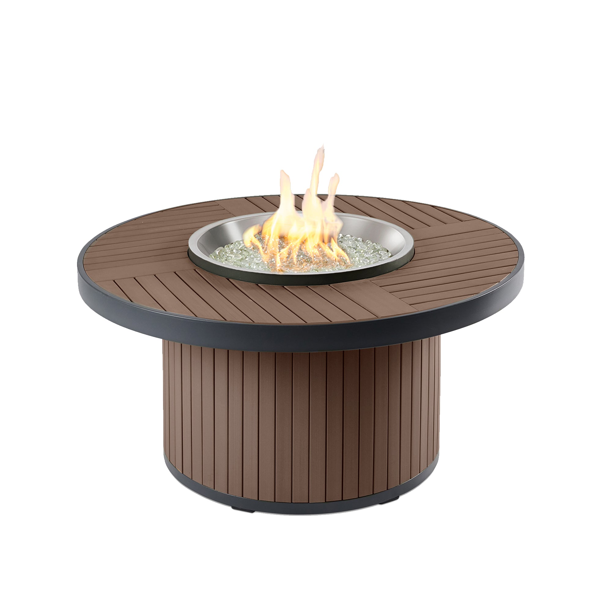 The composite deck top and base brings a modern, warm look to your outdoor room. Admire the easy-to-care-for design as you relax or entertain guests. The unique elevated 20” Round Crystal Fire® Plus burner is UL listed for safety and will dazzle guests
