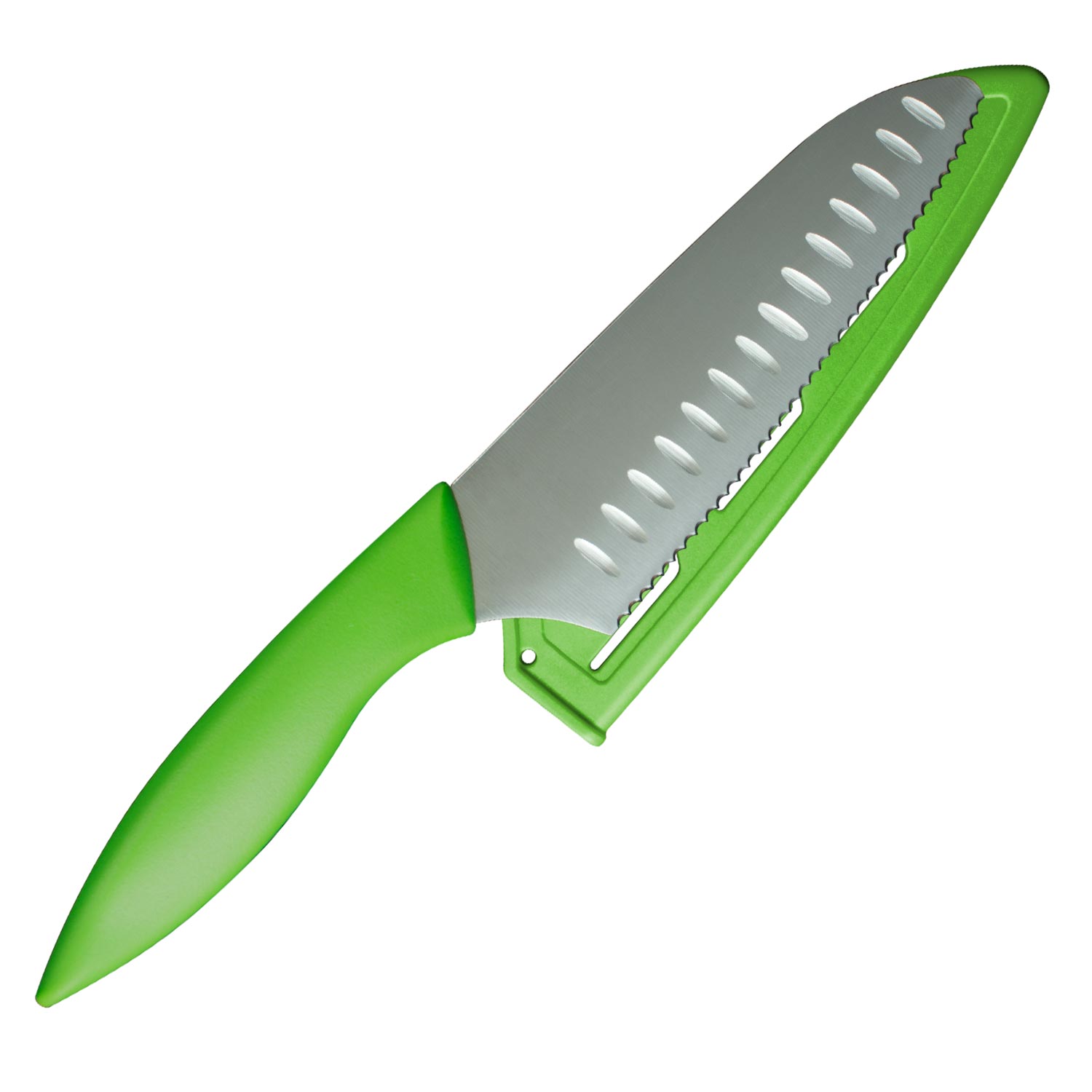 It has a rounded tip and heel, so the only sharp part is the cutting edge, making it much safer for kids to handle. Plus, it has small serrations to help grip food securely for non-slip cutting.
