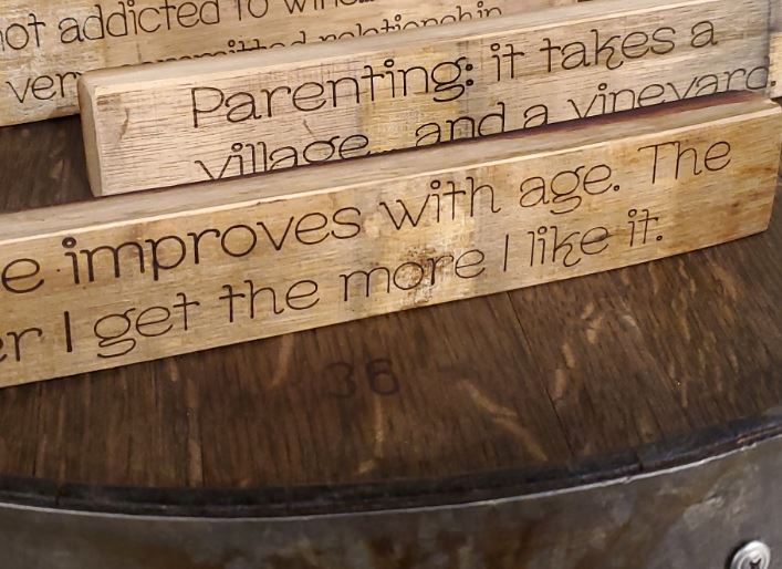- Laser-etched onto reclaimed wine barrel staves for a unique and rustic look