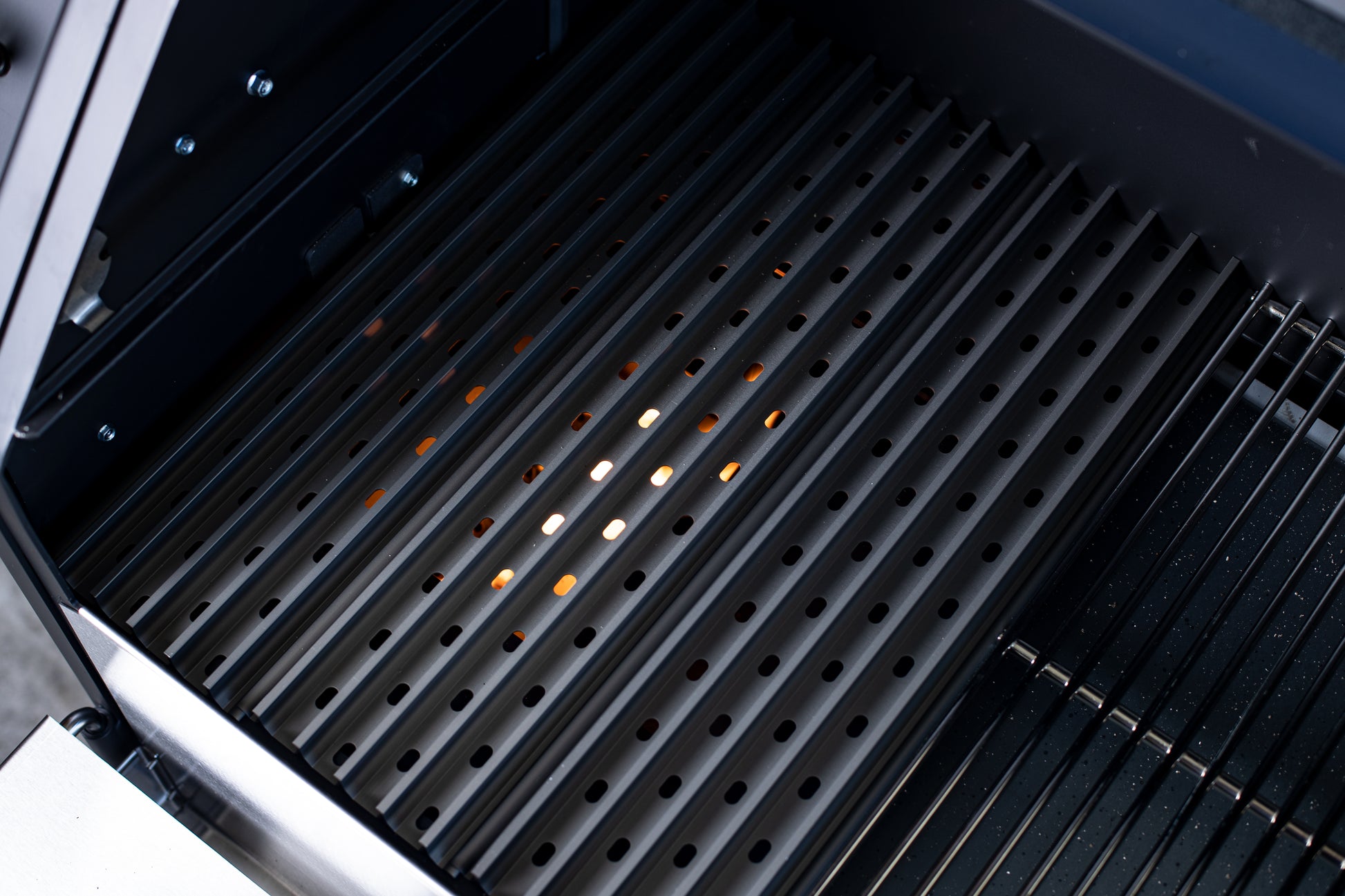 The Yoder Smokers two-piece heat diffuser for YS640 grills is a removable plate that allows you to easily sear any type of meat and is easily cleaned. This heat diffuser is made from 12-gauge steel and features 10" x 11" opening that allows you to easily finish and sear your meat. No other tool makes reverse searing as easy as this heat diffuser.